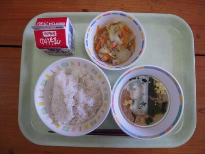 今日の給食献立は、「豚肉のしょうが炒め」「もずくスープ」「ご飯」「牛乳」です。