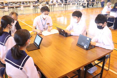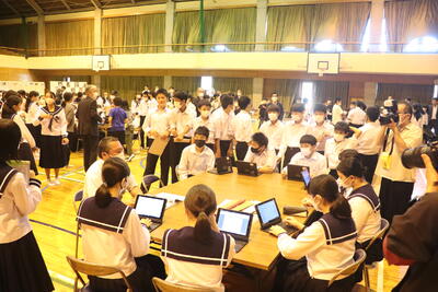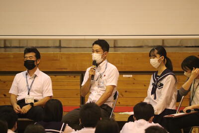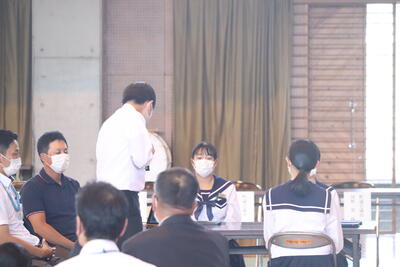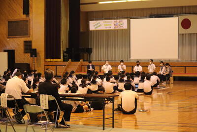 続いて、オープニングトークを行いました。これまで探究学習を進める中で、ご助言をいただきました、町教育員会 指導主事 奈須様、メンターの町役場 地域振興課 桝田様、杉本様、農林振興課 飯干様、甲斐様にご参加いただくとともに、代表生徒や職員代表も参加したメンバーで、オープニングトークを行いました。