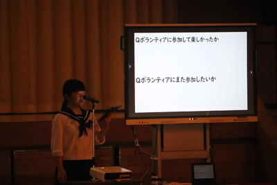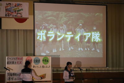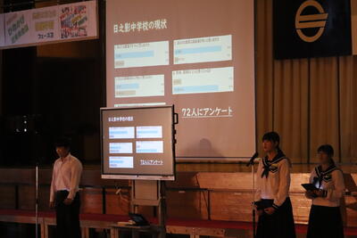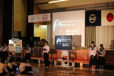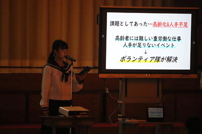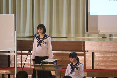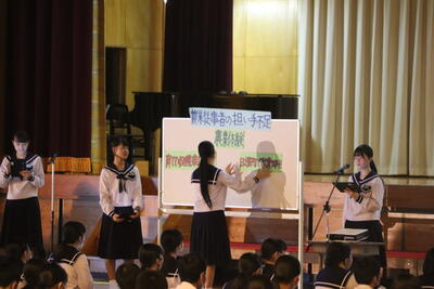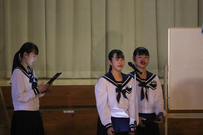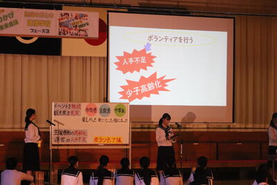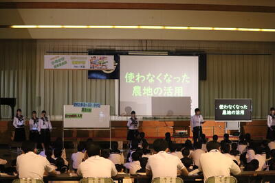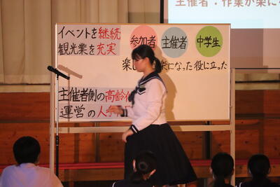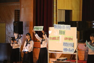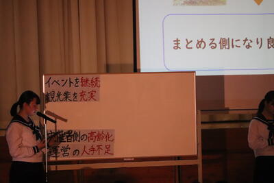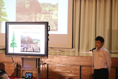 3年生は、2年間で培った学びの集大成とも言うべき学習です。「日之影町」と「私」との関わりの中で、「観光業の活性化」「里山の保全・活用」「農業の振興」について日之影町の支援のもと、その学習成果を発表することができました。当日は、役割分担の急な変更がありましたが、その臨機応変さ(しなやかさ)と、堂々たる姿(たくましさ)が光るすばらしい発表となりました。