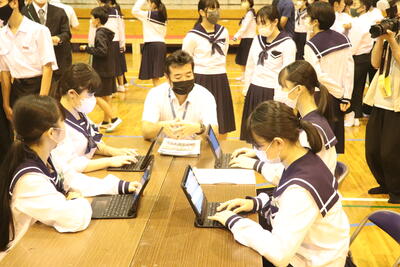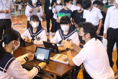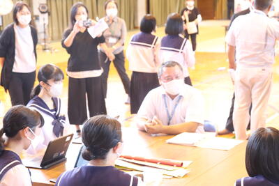 次に、町内の各小学校6年生や本校の1・2年生が、近くで参観する中、メンターの方から、各班の今回の発表についてやこれまでの取組について、貴重なお話をいただきました。