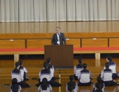 日之影町教育委員会 教育長 橋本 範憲 様より、3年生へ記念品をいただきました。そして、講評をいただき、これまでの学びへの励ましのお言葉をいただきました。