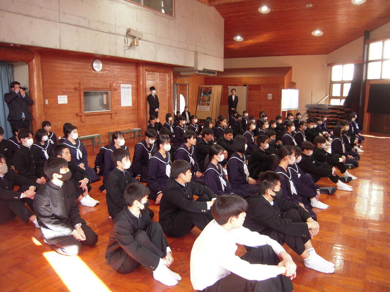時が経つのは早いもので、一年間が終わりました。この度の教職員人事異動で2名の先生方が異動されました。その離任式を行いました。転出された先生方は、教頭 濵砂 俊洋 先生、事務室 大塚 道夫 先生の2名です。1・2年生と卒業生全員が集まってくれました。