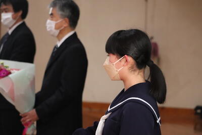 教頭 濵砂 俊洋 先生は、県教育委員会 中部教育事務所に異動になりました。事務室の大塚 道夫先生は、五ヶ瀬町立五ヶ瀬中学校に異動になりました。生徒を代表して、甲斐 文葉さんがお礼の言葉を述べました。