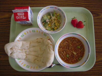今日の給食献立は、「キーマカレー」「グリーンサラダ」「いちご」「ナン」です。「ナン」はやはり、温められています。