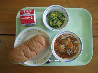 今日の給食献立は、「しゃきっとハッシュドビーフ」「ハムサラダ」「パン」「牛乳」です。