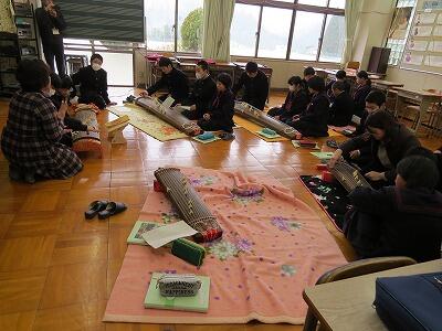 今回は地域のお助け隊の方にきていただき、筝を弾く時の正しい姿勢や基本的な奏法・調弦の仕方を教えていただきました。単音で弾いていた「さくらさくら」の演奏にアレンジが加わり、とても素敵な演奏に変わりました。