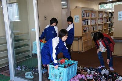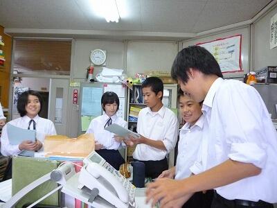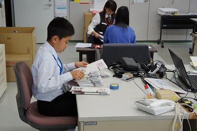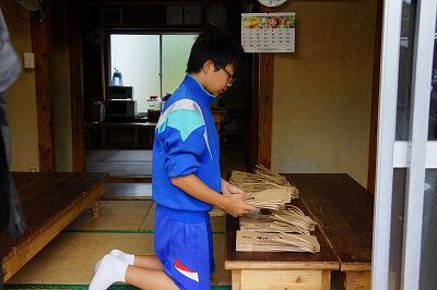 修学旅行で販売する干し椎茸を選別して包装し、シールを貼りました。