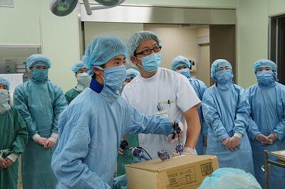 腹腔鏡を使って、胆のう摘出の模擬体験をしました。