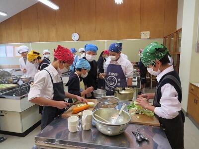 今回は、三ケ所小学校栄養教諭の先生にも入っていただき、実習を行いました。小学校の時にお世話になった人もいますが、久しぶりに顔を見てその成長ぶりに驚いていました。また、中学生の手際の良さにも感心していらっしゃいました。