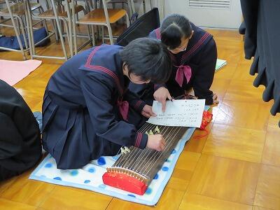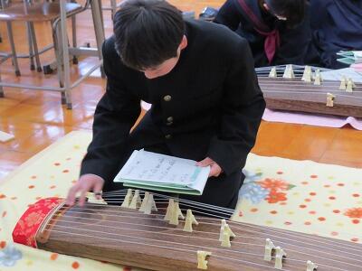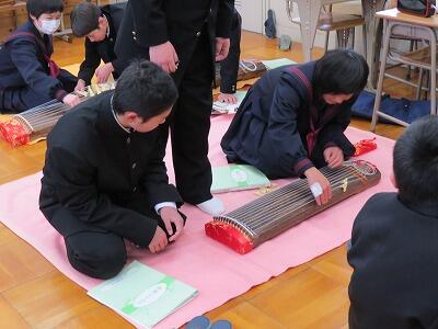 音楽の授業で筝の学習をしています。「さくら さくら」を班で協力しながら練習しています。