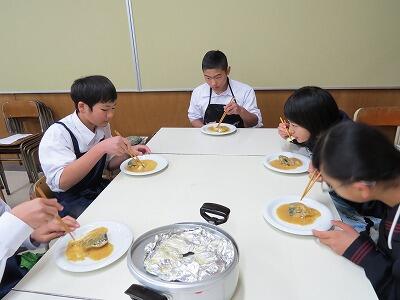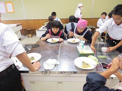 今回は、三ケ所小学校栄養教諭の先生にも入っていただき、実習を行いました。小学校の時にお世話になった人もいますが、久しぶりに顔を見てその成長ぶりに驚いていました。また、中学生の手際の良さにも感心していらっしゃいました。