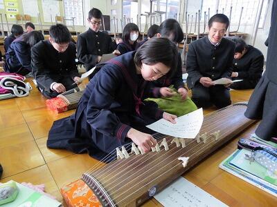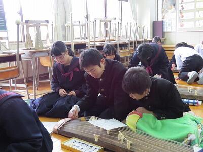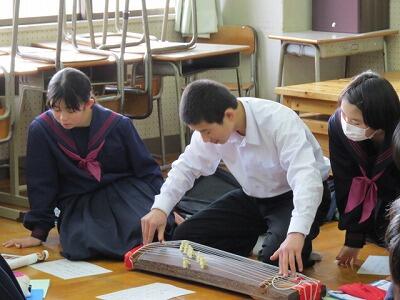 音楽の時間に筝の演奏に挑戦しました。「さくらさくら」を1曲演奏できるように頑張っています!