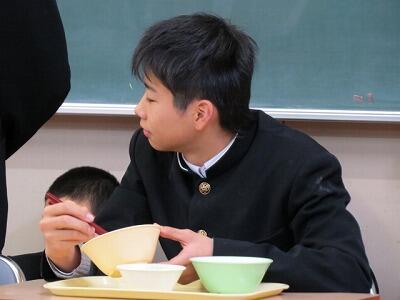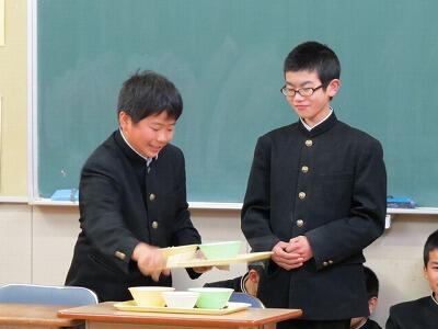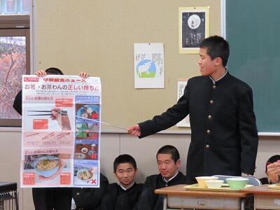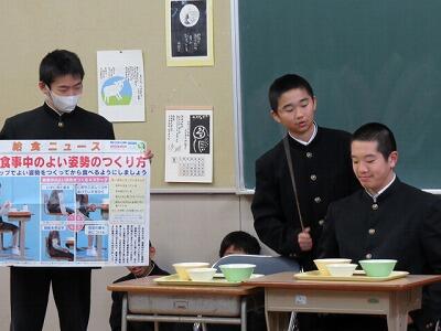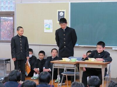 学校給食を支えてくださる多くの方々へ、感謝の気持ちを伝えるために「給食感謝集会」をおこないました。まず、保体給食委員会の生徒が、自分たちの給食時間の気になる点を劇にして発表しました。役者ぞろいで、楽しく発表できました。