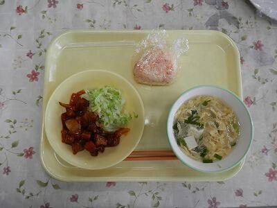 給食の先生方の心のこもったおいしい料理がいっぱいでした。おにぎり、ジャリパン、クロワッサン、からあげ、イカフライ、えびちり、ブロッコリーサラダ、ハンバーグ、卵焼き、コーンスープ、雪見大福・・・。生徒の幸せいっぱいの顔が印象的でした!