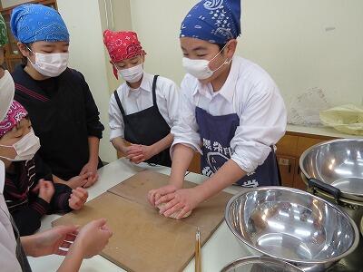 今日で1年生の調理実習が終わりました。最後の実習は「うどん」を打ちました。こねる作業が結構大変でしたが、根気よくこねて「コシ」のあるおいしい麺が出来上がりました。
