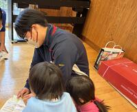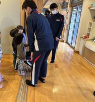 最初は双方、緊張している様子でしたが、次第に打ち解け、仲良く遊ぶ姿が見られました。また、事前に授業で作っていた折り紙等のおもちゃもプレゼントして、喜んでもらえました!
