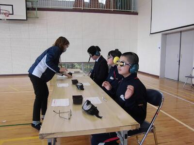体の不自由さを体験する活動では、思うように体が動かせず苦労をする姿が見られ、介助をしてもらうことでやっとの思いで立ち上がっていました。また、耳や目に不自由さを感じる体験では、思っていた以上に文字が書きづらかったり、指先が器用にうごかせなかったりと時間をかけながらの活動となっていました。