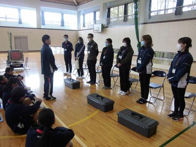 第1学年を対象にした、福祉体験学習を行いました。五ヶ瀬町社会福祉協議会の方々に来ていただいて、[体の不自由さを感じる疑似体験・車いす体験]をさせていただきました。