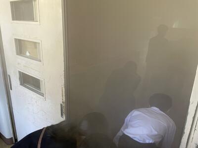 その後、校舎に戻り[煙体験]を行いました。体験用の煙を使用し、教室いっぱいに煙を充満させた中を通りながら非難するという活動でした。煙によって視界が悪く、立っていることさえ恐怖を感じ、身を低くしながら移動する大変さを学ぶことができました。