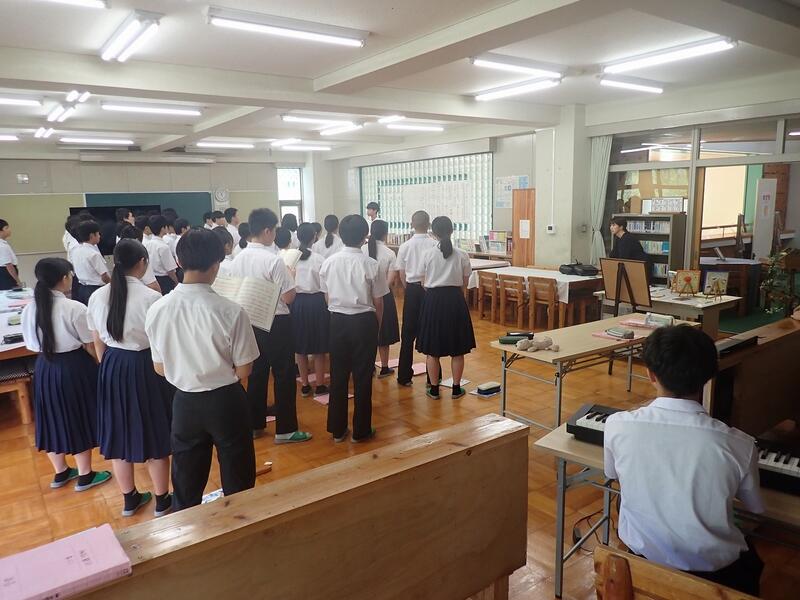 9月18日(木)の5時間目に全校音楽②が実施されました。図書室で声出しを行い、各パートに分かれて練習を行いました。