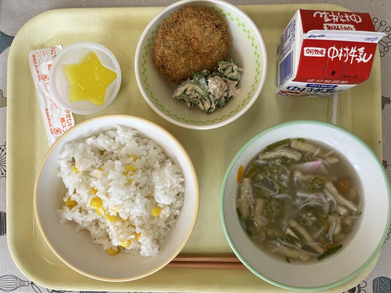 「コーンご飯、七夕汁、キャベツのメンチカツ、ゴーヤの和え物、七夕ゼリー」