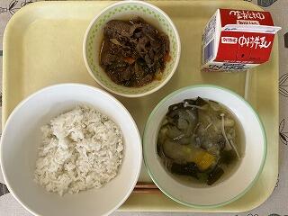 「麦ご飯、夏野菜のみそ汁、宮崎牛焼肉丼、牛乳」