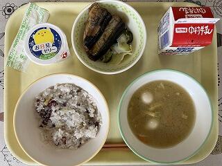 「麦ご飯、豚汁、いわしフライ、ゆかり和え、節分豆」