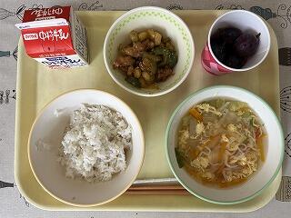 「麦ご飯、レタスと卵のスープ、鶏肉とゴーヤの揚げ煮、五ヶ瀬ぶどう」