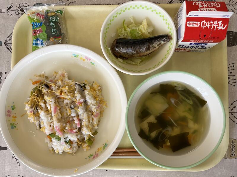 「ちらし寿司、わかたけ汁、いわしの生姜煮、キャベツ、かしわ餅」