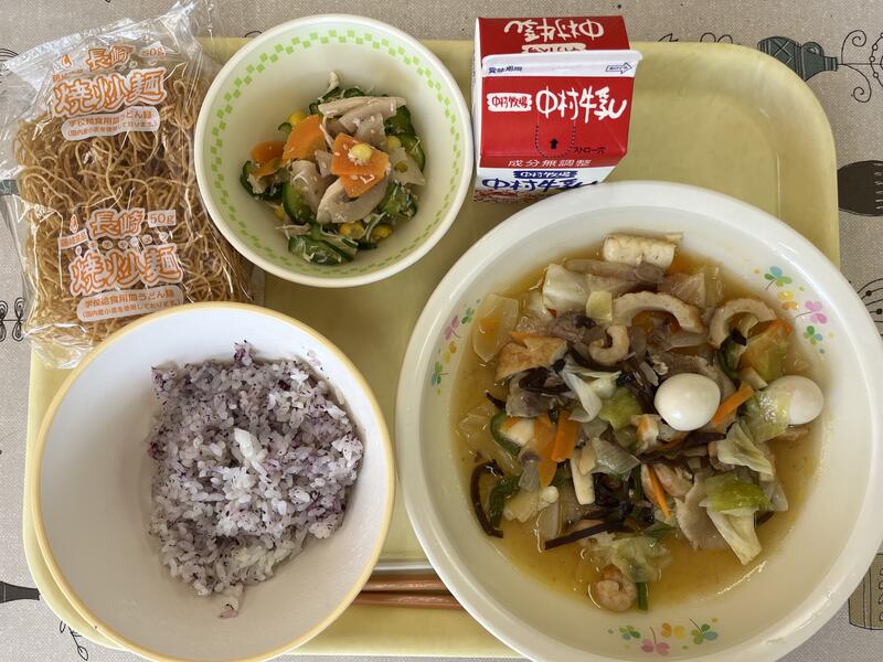 「減量ゆかりご飯、皿うどん、れんこんサラダ、牛乳」