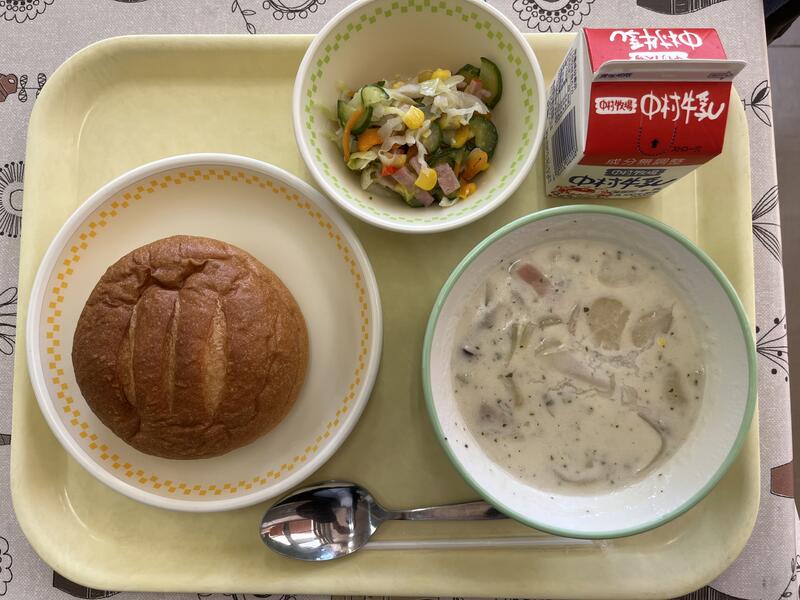 「米粉パン、ホタテのクラムチャウダー、カラフルサラダ、牛乳」