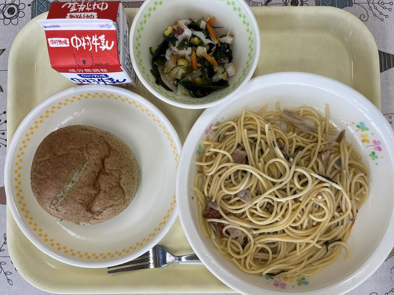 「もちもちお茶めパン、きのこスパゲティ、海藻サラダ」