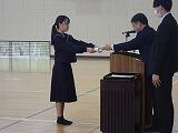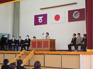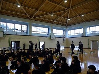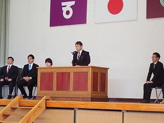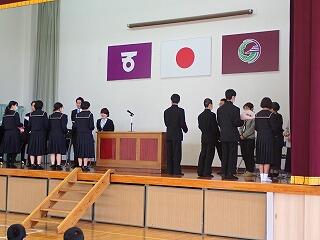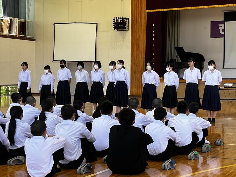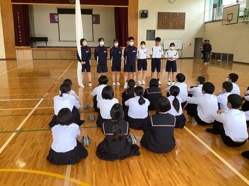 新保体副委員長の進行のもと、男子剣道部個人・団体戦の選手が県大会への決意を表明し、新生徒会長と矢括先生の激励の言葉と新演奏者と指揮者のもと校歌斉唱がありました。