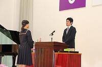 スローガン発表のあと、生徒会長の甲斐さんと体育大会実行委員長の田中さんが