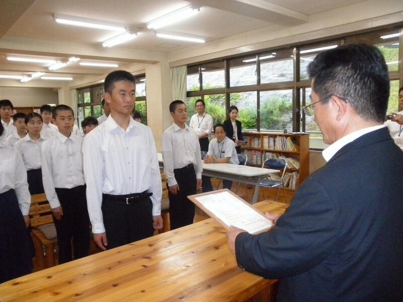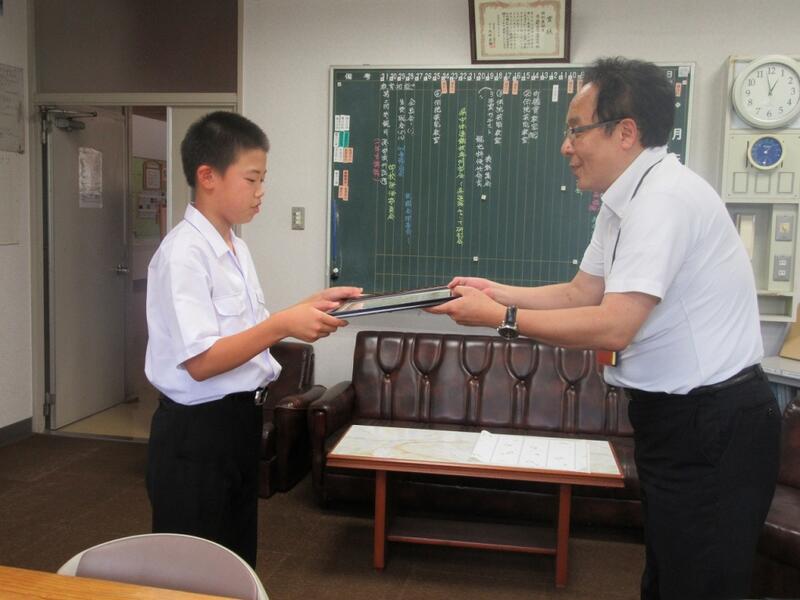 五ヶ瀬中1年生の甲斐 陽向くんが考えた名前が選ばれたので、昼休みの時間に教育長から表彰して頂きました。