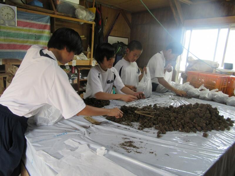 その後、3週間行われた教育実習生の挨拶があり、生徒全員で教育実習生に向けて、エールを送りました。椎茸の袋詰め作業を行いました!