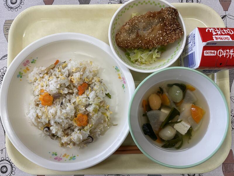 ちらし寿司のにんじんはお花型になっており、かわいらしい給食になりました。
