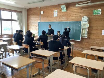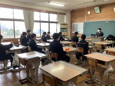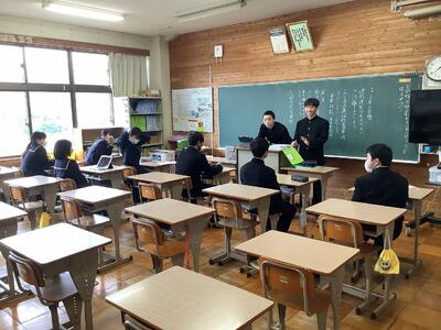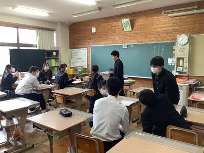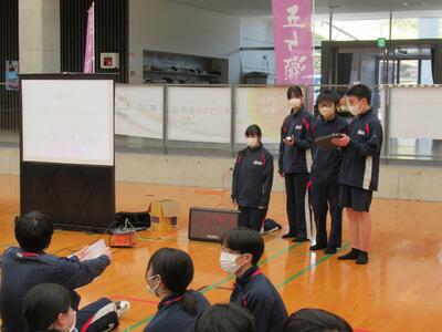 2月5日(水)最上級生の3年生が、次年度中学校に入学予定の小学6年生に向けて、「小中ひなた場」を開きました。中学校の学習教科や各行事、部活動等の紹介の後、各グループに分かれて「私の人生グラフ」、「中学生への質問コーナー」がありました。6年生からは、部活動の活動時間や給食時間のこと、そして高校入試など様々な質問が出されました。