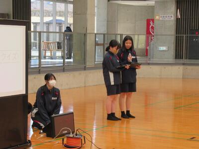 Gドームに着き、まずは送別行事を行いました。内容は、「なぞなぞ・シルエットクイズ・イントロクイズ・3年生のこれまでを振り返る動画視聴」でした。クイズは学年混合のチーム戦でした。チーム内で相談しながら答えを考え、とても盛り上がりました!