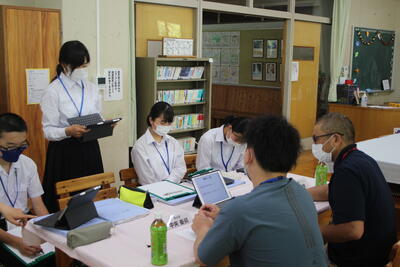 6月22日に、五ヶ瀬町役場の各課(企画課・農林課・福祉課・教育委員会)から合わせて8名の皆様に、メンターとしてお越しいただき、3年生のGDP発表会に向けてのアドバイスをいただきました。