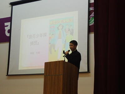午前の部では、例年のプログラムにある英語科の「英語暗唱・弁論」、合唱発表に加えて、国語科の「ビブリオバトル」、理科の「夏休み自由研究」、音楽科の「琴演奏」、そして伝統芸能の発表を行いました。