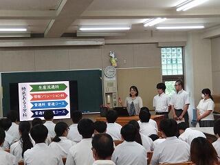 7/2(水)の5・6時間目に県立高校説明会が行われました。校長先生のあいさつでは、「自分を知る」ことの重要性についての話があり、説明会の中で、「自分がその高校に進学したらどんな力がつくのか」を考えながら話を聞いてくださいとお話がありました。今回の説明会では、県内の5校の県立高校の先生方をお招きし、お話をしていただきました。生徒たちも自分の将来や、どんな力が身につくのかを真剣に考えながら聞いていました。