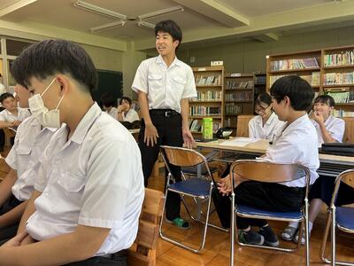 生徒代表のお礼では、今日の学びの振り返りとともに、五ヶ瀬の良さを紹介する場面もありました。また、お越しくださったお二人からは、「これからも英語を積極的に学んでほしい」「ぜひまた会いましょう」というメッセージをいただきました。エヴァン先生とアンジェリカ先生、また五ヶ瀬に遊びに来てください!
