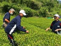 福重教頭先生と筒井先生は、五ヶ瀬中で初めてのお茶摘みです。