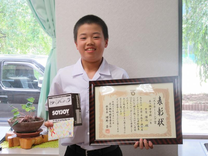 五ヶ瀬中1年生の甲斐 陽向くんが考えた名前が選ばれたので、昼休みの時間に教育長から表彰して頂きました。