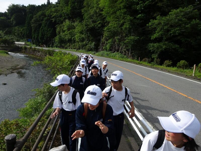 心配された天気も、午前中は晴天に恵まれ、町役場駐車場に時間通りに集合していた生徒たちでした。8時になり、出発式を終え、いざキャンプ場へ出発です!5.6kmの道のりを、途中休憩を入れながら歩き、全員無事に到着することができました。
