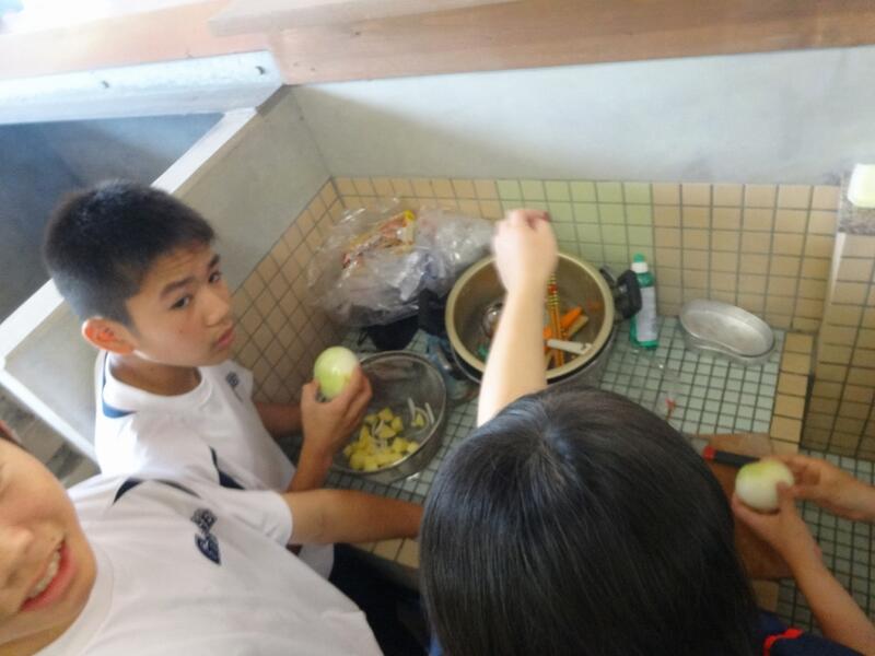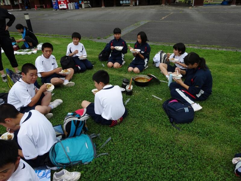 さぁ、これから、飯盒炊さん・カレーづくりです!1・3年生の縦割り班に分かれて調理です!火をおこし、ご飯を炊き、材料を切って炒めます。