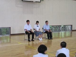 卒業生3名に、高校生活について、また、受験への心構えについて話をしていただきました。生徒は真剣に先輩の話に耳を傾けていました。今後の学校生活や進路選択の参考になるお話でした。先輩方、ありがとうございました。