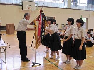 本日、登校日の全校集会にて、女子剣道部の宮崎県総合体育大会の優勝旗の校納がありました。