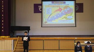 次に生徒会総務より、今月行われる中学生サミットで発表する世界農業遺産のプレゼンの発表がありました。